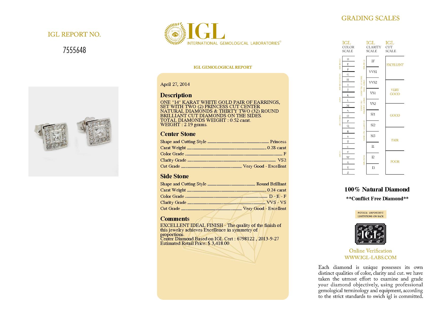 עגילים מרובעים, יהלומים מרכזיים בחיתוך "פרינסס" (PRINCESS) של 0.14 קראט כל אחד בצבע F ונקיון VS2 ובשילוב 32 יהלומים עגולים במשקל של 0.24 קראט.